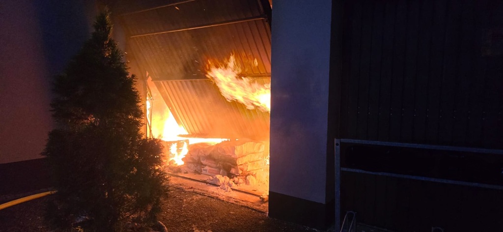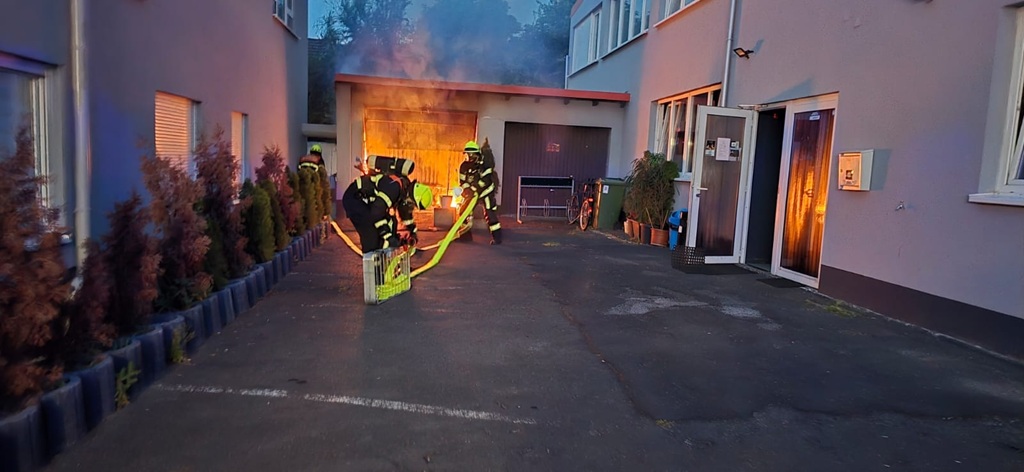 Den Einsatzkräften schlugen bei Ankunft offene Flammen aus einer halb geöffneten Garage entgegen. Die nähere Erkundung zeigte, dass das Feuer auch schon auf die danebenstehende zweite Garage übergriffen hatte. Außerdem war Rauch durch geöffnete Fenster in die beiden angrenzenden Gebäude (ein Wohnhaus und eine als Fitnessstudio genutzte Halle) eingedrungen.