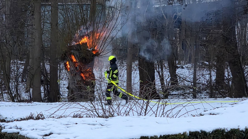 Vor Ort fanden die Einsatzkräfte eine hohle Weide vor, die von innen heraus brannte.