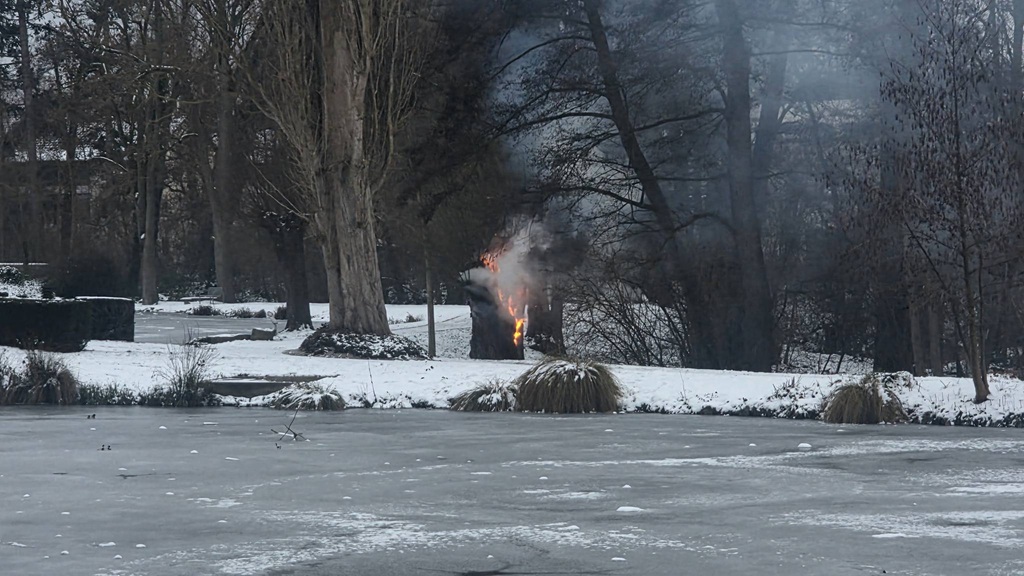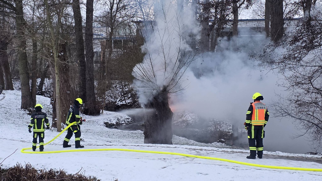 Vor Ort fanden die Einsatzkräfte eine hohle Weide vor, die von innen heraus brannte.