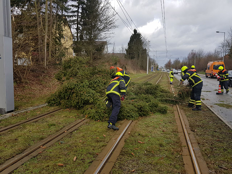 Der Sturm hatte die ersten Bäume umgeworfen. Ein Baum fiel z.B. im Bereich des Musikerviertels in die Oberleitung der Straßenbahn. Dieser musste zusammen mit Mitarbeitern der KVG zersägt und von den Gleisen geräumt werden.